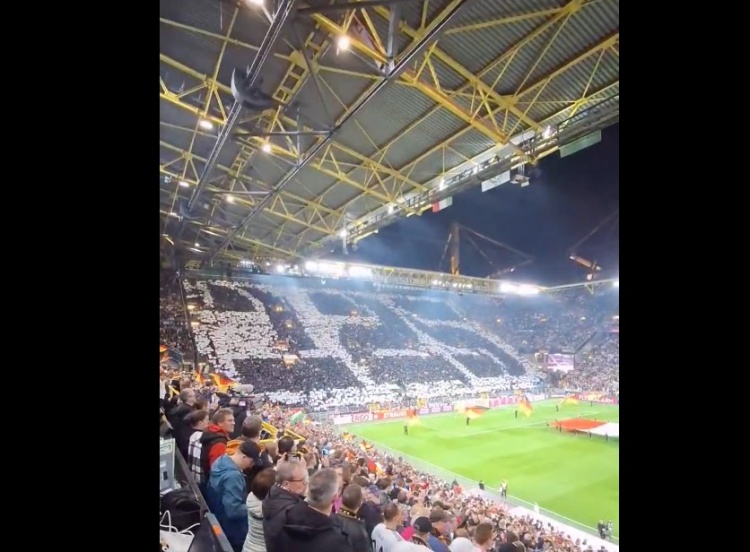 3月24日讯 德国在欧国联八强战次回合再战意大利,赛前多特蒙德的主场球迷们打出了巨型TIFO致敬德国足协成立125周年。
